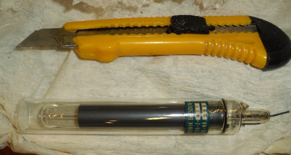 counter tubes: A main criteria of counter tubes is the "active area" of the tube. Quite reasonable, the bigger an area the higher the probability that a radiation quantum finds its way through it and is being detected. The tubes listed here are all bigger than those usually used in handheld radiation detectors. Another important criteria is the wall thickness or -density. Also quite clear because the radiation quantum to be measured must pass through this wall. While high energy gamma rays also penetrate steel walls, beta radiation passes glass you need very thin windowed window counter tubes to measure alpha radiation. By chosing the proper counter tube material you can influence the spectral response of a counter tube. Wall thickness is usually given in "weight per cm2", usually in mg/cm2. Standard handheld geigercounterubes have wall thicknesses in the region of 100mg/cm2, alpha-detecting tubes have windows in the weight region of 1-3 mg/cm2. No need to mention that those thin windows are extremely fragile and to be treated with very very very much care... |