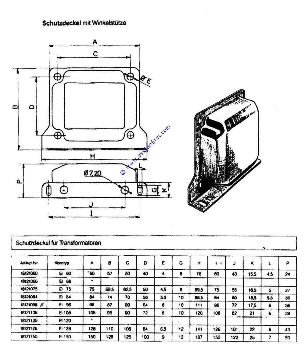Produktbild Symbolbild Produktbild TRAZ06 Trafoabdeckhaube für EI- Kern. Abmessungen siehe Datenblatt. Größe EI 126. mit Winkelfuß für stehende Montage Transformer cover, for dimensions see datasheet. Steel, surface treated with mounting foot for upright assembly Size EI 126 Capot pour transfos, fer, EI 126 13,70 16,30 Frag Jan Zuerst GmbH&CoKG