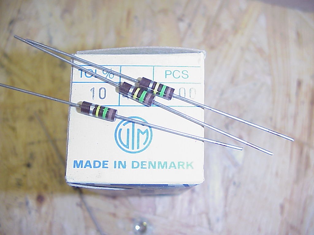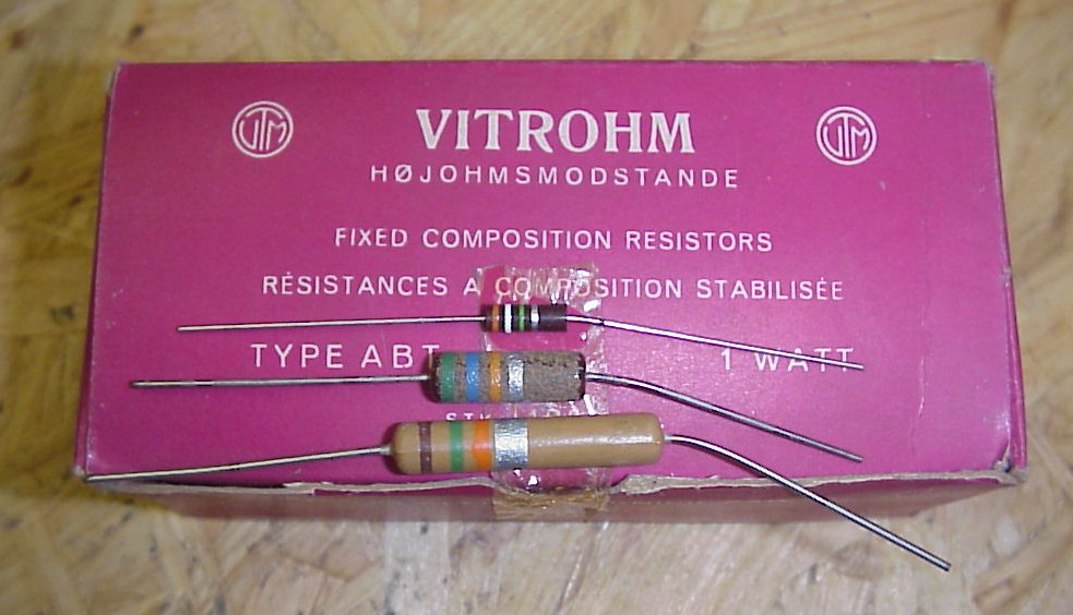 | Echte Carbon Composition Resistors (Kohlemassewiderstände) aus originaler, alter Fertigung. Gefertigt in den 50er und 60er Jahren von Vitrohm in Dänemark. Qualitätswiderstände in ausgezeichnetem Zustand, da trocken und sorgfältig gelagert. Damit lassen sich stilecht alte Geräte reparieren oder nach alten Plänen neu bauen. | Real NOS Carbon composition resistors made by Vitrom in Denmark. Stored in a dry environment, perfect condition, the perfect choice for repairing, upgradiong and design of amps, radios etc. | Résistances agglomérés stabilisés. Marque VITROHM, Danmark. Idéal pour restaurer, améliorer ou désigner les vieux amplis, postes etc. | ||||||
